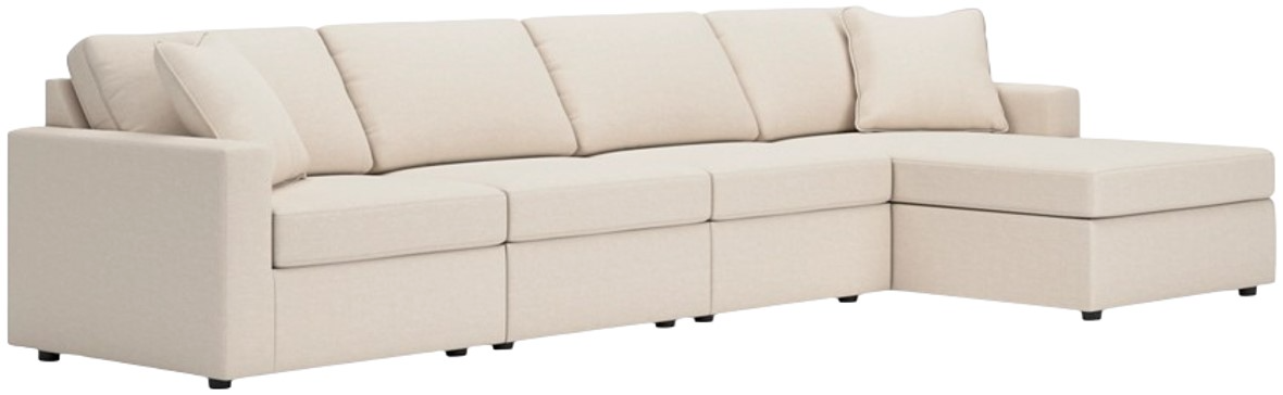 Comprend 4 éléments modulaires : fauteuil d'angle avec accoudoir gauche, 2 fauteuils sans accoudoirs et chaise longue d'angle avec accoudoir droit.