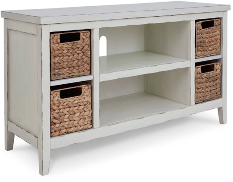 Apportez l'ambiance vintage décontractée que vous aimez dans votre salon avec ce meuble TV. Une solution de rangement élégante dans une finition blanche antique, cette pièce charmante complète votre espace de divertissement avec facilité. Les étagères ouvertes et les paniers tressés à la main inclus offrent un look magnifique sans effort et des possibilités infinies.Read More