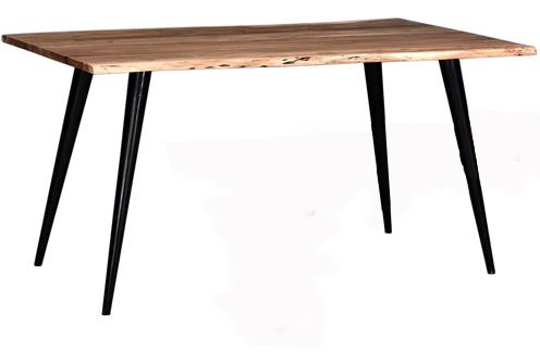 Cet ensemble de salle à manger possède une table rectangulaire avec un dessus en bois Acacia et une base en métal.